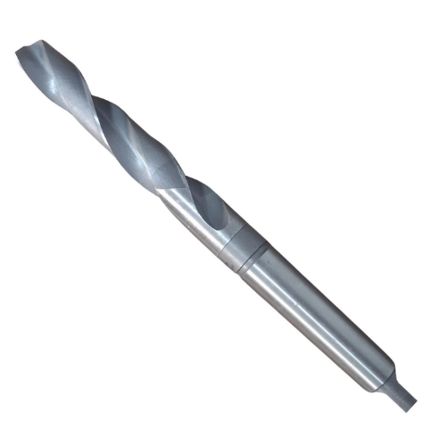 Fixação: haste cônica Morse (não é cilíndrica como nas brocas menores), que encaixa diretamente no morse taper da furadeira de coluna, torno ou adaptador.